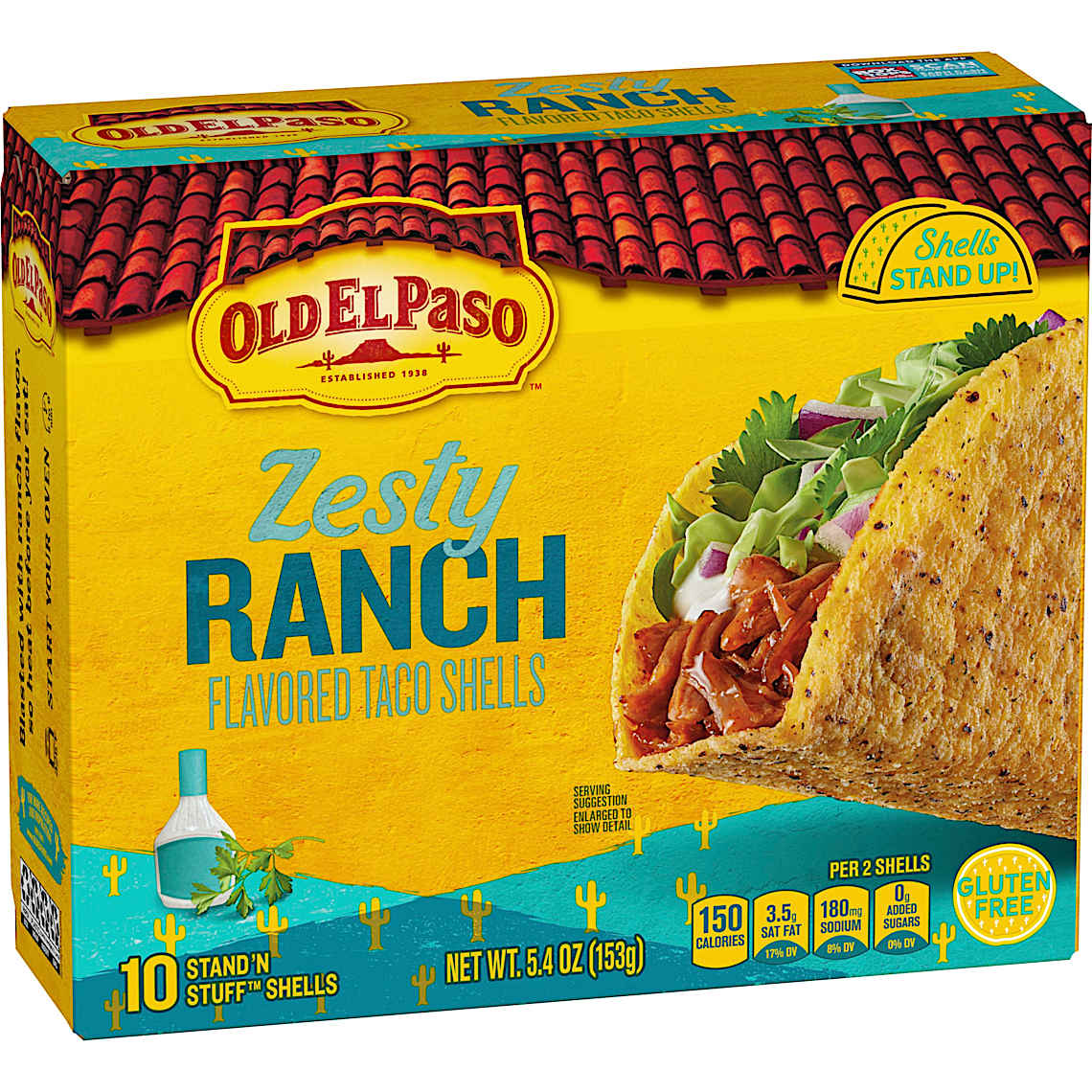 Add more flavor to taco night with Old El Paso Stand 'N Stuff Zesty Ranch Flavored Taco Shells. Our Stand 'N Stuff Shells have a flat bottom so they stand up on their own. Gluten free, these corn taco shells are blasted with ranch flavor to make meal times even more fun and delicious. For maximum crunch and to bring out the ranch flavor, heat in the oven at 325°F for about six to eight minutes until crisp. Fill the space in these taco shells with your favorite meats, cheeses, beans, and fresh toppings like avocado and tomatoes for a rich flavor feast. These shells help make it easy to get dinner to the table quickly. However you enjoy them, Old El Paso brings you tasty and easy ways to share the food you love with the people you love. For more than 80 years, Old El Paso has been bringing families and communities together to celebrate old and new traditions around delicious, Mexican inspired flavors. Contains one cardboard box of 10 whole Old El Paso Zesty Ranch Flavored Stand 'N Stuff Taco Shells; 5.4 oz.